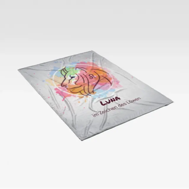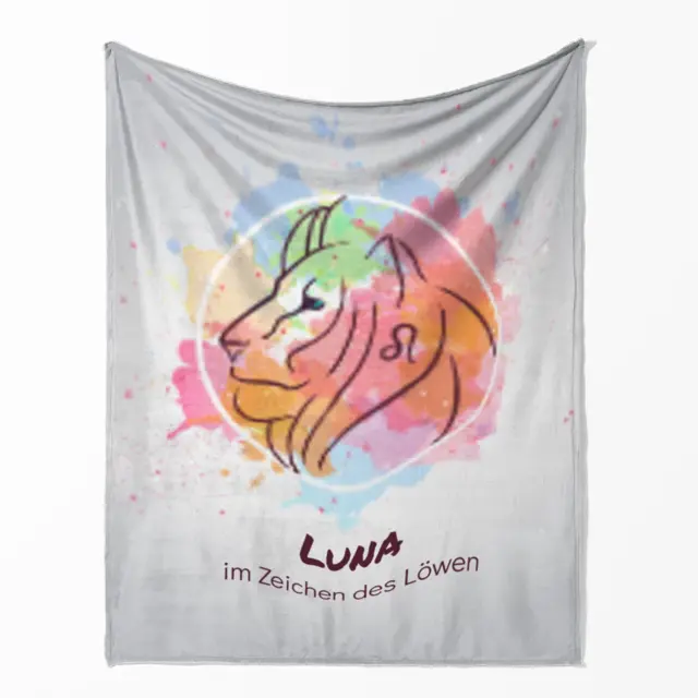 Fotodecke als Geschenk gestalten – 140 x 200cm – Sternzeichen Löwe Splashes mit Namen bunt