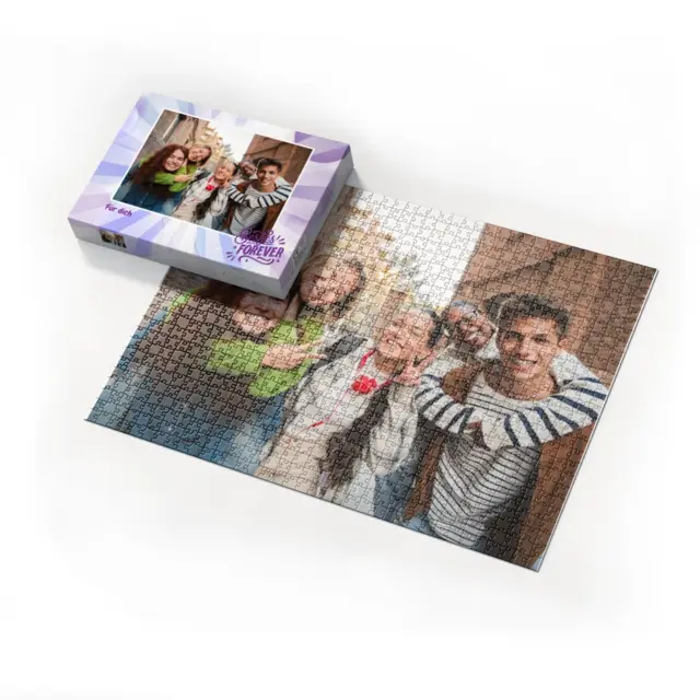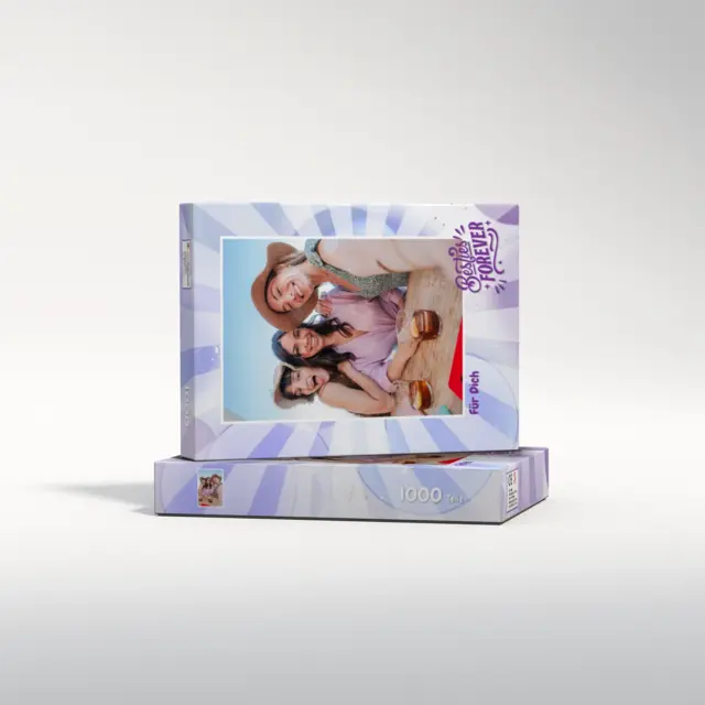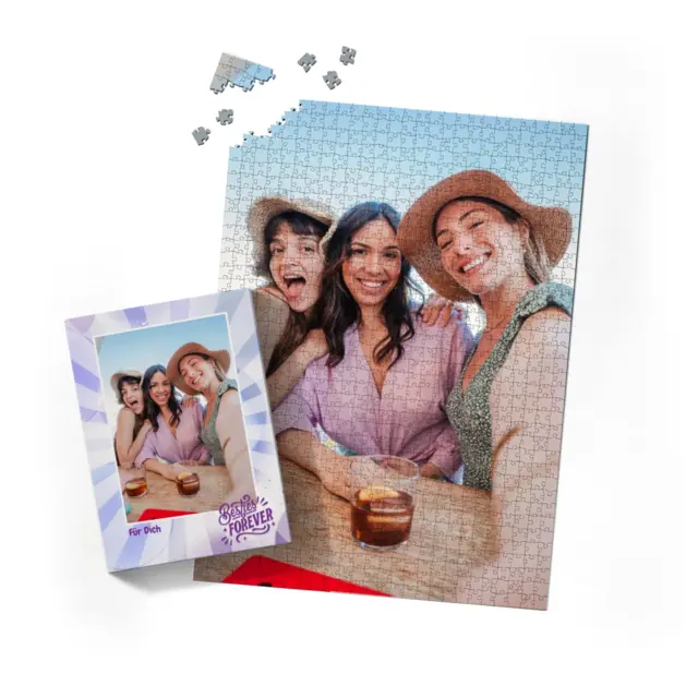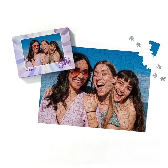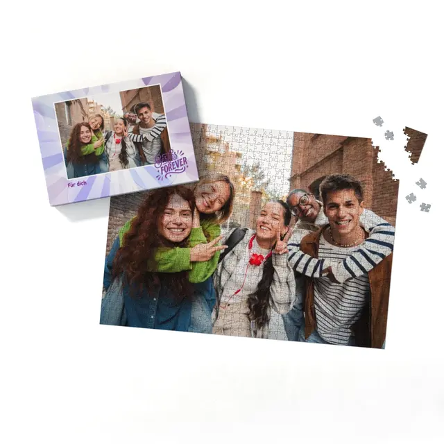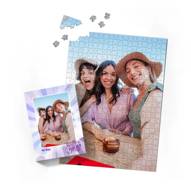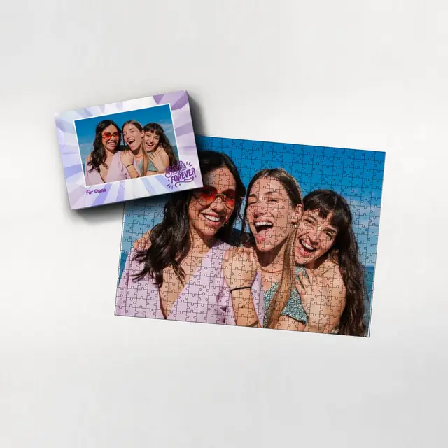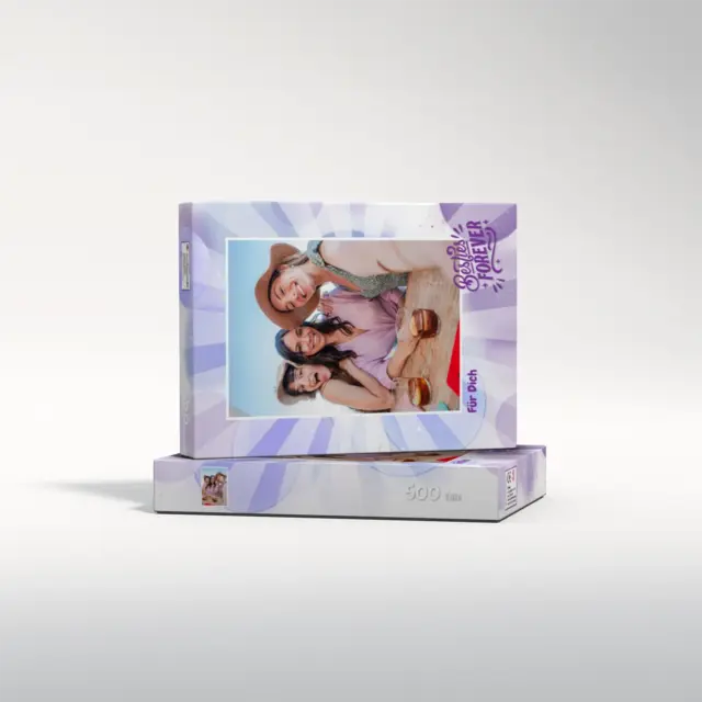 Ein individuell gestaltetes Fotopuzzle verwandelt Ihre schönsten Erinnerungen in ein ganz besonderes Erlebnis zum Zusammensetzen. Ob liebevolles Familienfoto, lustiger Schnappschuss oder ein Foto Ihres Haustieres – aus jedem Motiv entsteht ein persönliches Puzzle, das Freude schenkt und besondere Momente festhält. Mit der Puzzle-Schachtel Besties wird daraus ein rundum perfektes Geschenk, das schon beim Auspacken für strahlende Augen sorgt. Das Puzzle wird in einem stabilen Karton geliefert, dessen liebevoll gestaltetes Design den Charakter Ihres Fotogeschenks harmonisch ergänzt. Die Schachtel wirkt wie ein hochwertiges Präsent, das ganz ohne zusätzliche Verpackung auskommt. Dabei ist die Box nicht nur dekorativ, sondern auch funktional: Sie schützt das Puzzle zuverlässig, sorgt für eine ordentliche Aufbewahrung und wird dank ihrer wertigen Optik und Haptik selbst oft zum kleinen Erinnerungsstück.