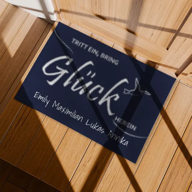Eine personalisierte Fotofußmatte macht jeden Eingangsbereich zu etwas ganz Besonderem. Ob ein herzliches Familienfoto, ein Willkommensgruß, ein witziger Schnappschuss oder ein Bild Ihres geliebten Haustieres – Ihre schönsten Erinnerungen werden hier zu einem praktischen und zugleich dekorativen Hingucker. Mit der Matte Tritt ein, bring Glück herein schenken Sie nicht nur einen individuellen Willkommensgruß, sondern sorgen auch dafür, dass jeder Besucher schon beim Betreten Ihres Zuhauses ein Lächeln auf den Lippen hat. Die Matte ist strapazierfähig, rutschfest und pflegeleicht – perfekt für den täglichen Gebrauch, ohne dass die Schönheit Ihres Motivs verloren geht.