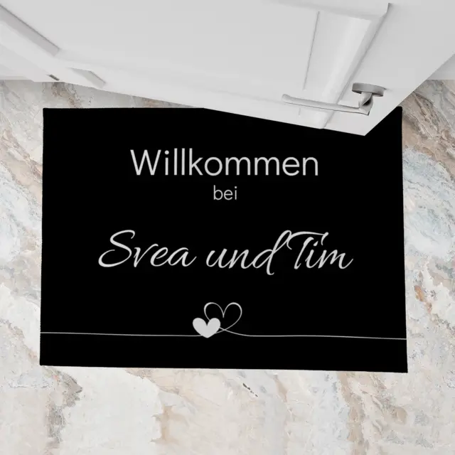 Gestalten Sie Ihre Matte mit der Vorlage Willkommen Herz in schwarz im Handumdrehen! Klicken Sie auf „dieses Design verwenden“. Ihr ausgewähltes Design wird automatisch in Ihr Layout übernommen. Jetzt brauchen Sie nur mehr Ihren Text einzugeben oder Ihre Fotos hochzuladen. Fertig ist Ihre personalisierte Matte. Noch nicht ausreichend individuell? Die Farbe schwarz passt nicht zu Ihrer Einrichtung? In der Layoutanwendung können Sie die ganze Matte nach Ihren eigenen Vorstellungen anpassen: Verändern Sie direkt in der Anwendung Farben, fügen Cliparts ein, tauschen Fotos aus oder ändern das Layout, bis alles perfekt zu Ihrem Stil passt.