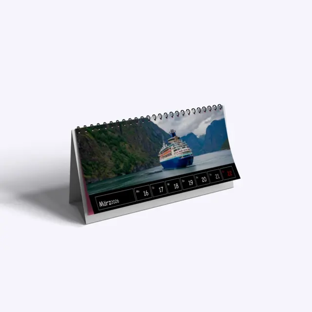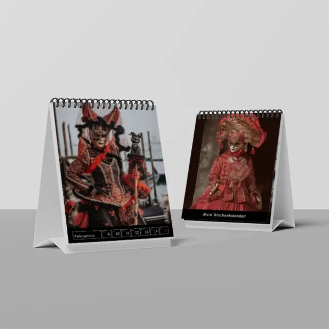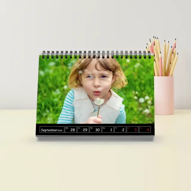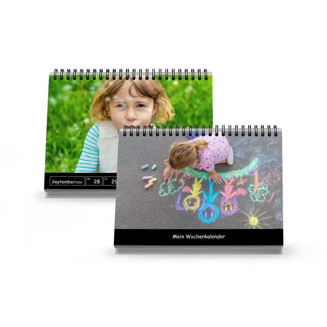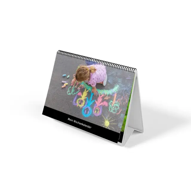 Gestalten Sie Ihren ganz persönlichen Tischwochenkalender als 29,7 x 10,5cm ganz einfach online und noch einfacher mit unserem Design Classic unten CS in schwarz! Der Wochenkalender mit stabilem Tischaufsteller bietet jede Woche Platz für Ihre schönsten Fotos und Erinnerungen. Ob Familienmomente, Urlaubsbilder oder Lieblingsmotive – jedes Kalenderblatt wird zu einem kleinen Kunstwerk, das Sie Woche für Woche das ganze Jahr über begleitet.